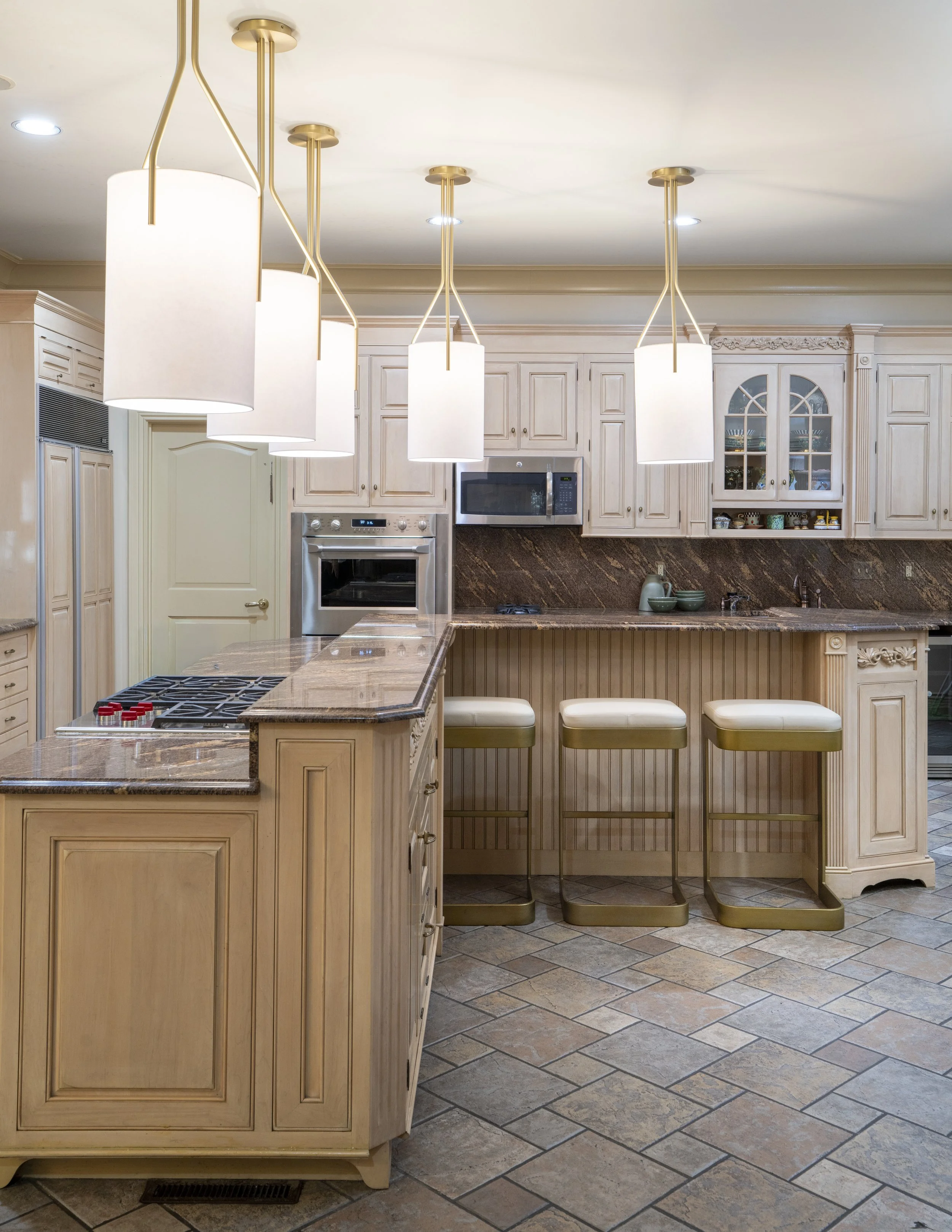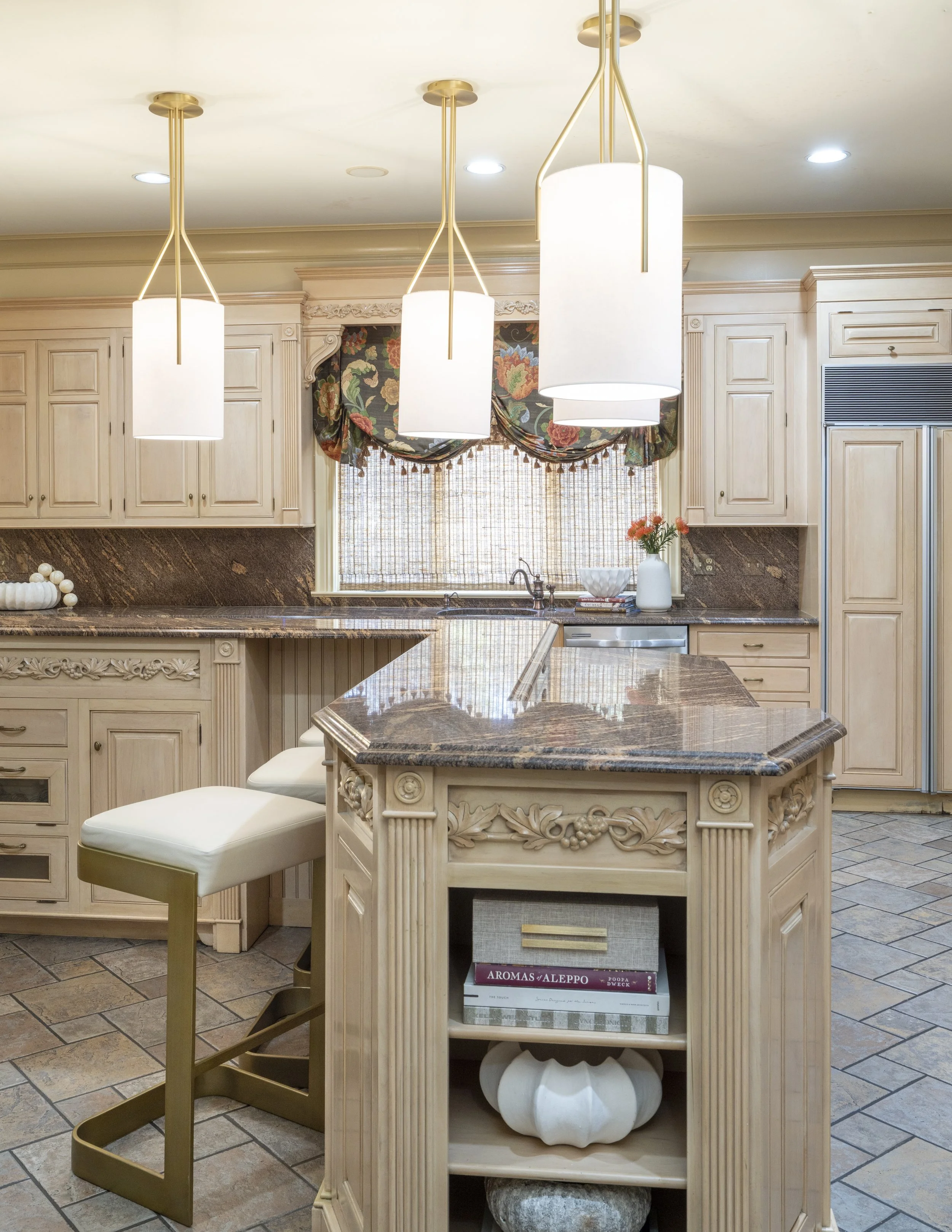 The breakfast nook flows seamlessly into the kitchen, and we extended the refresh into this space. Modern drum pendants were installed above the island, replacing the ornate Moroccan fixtures. New counter stools with a sleek silhouette balance comfort and elegance. Subtle yet impactful, these updates breathe new life into the kitchen.