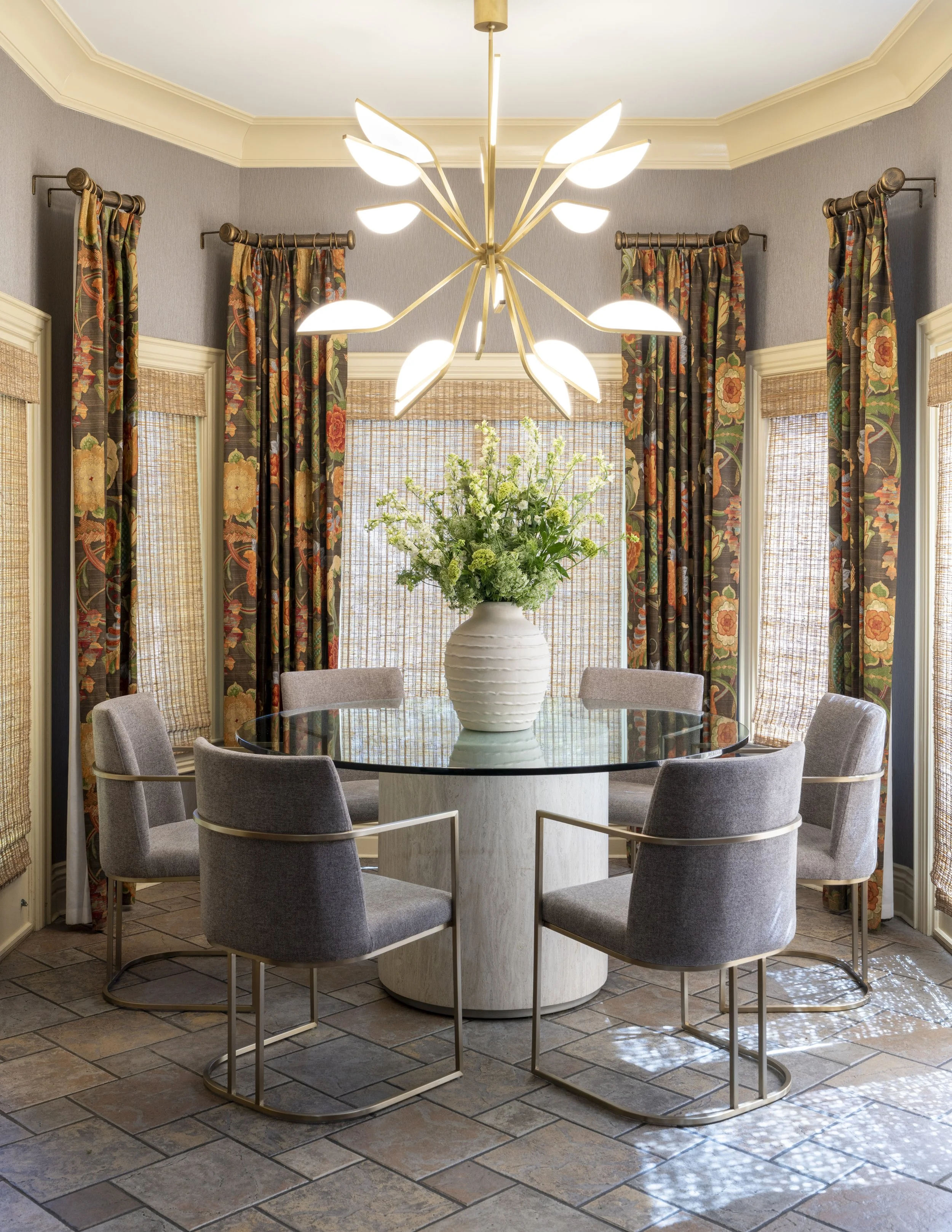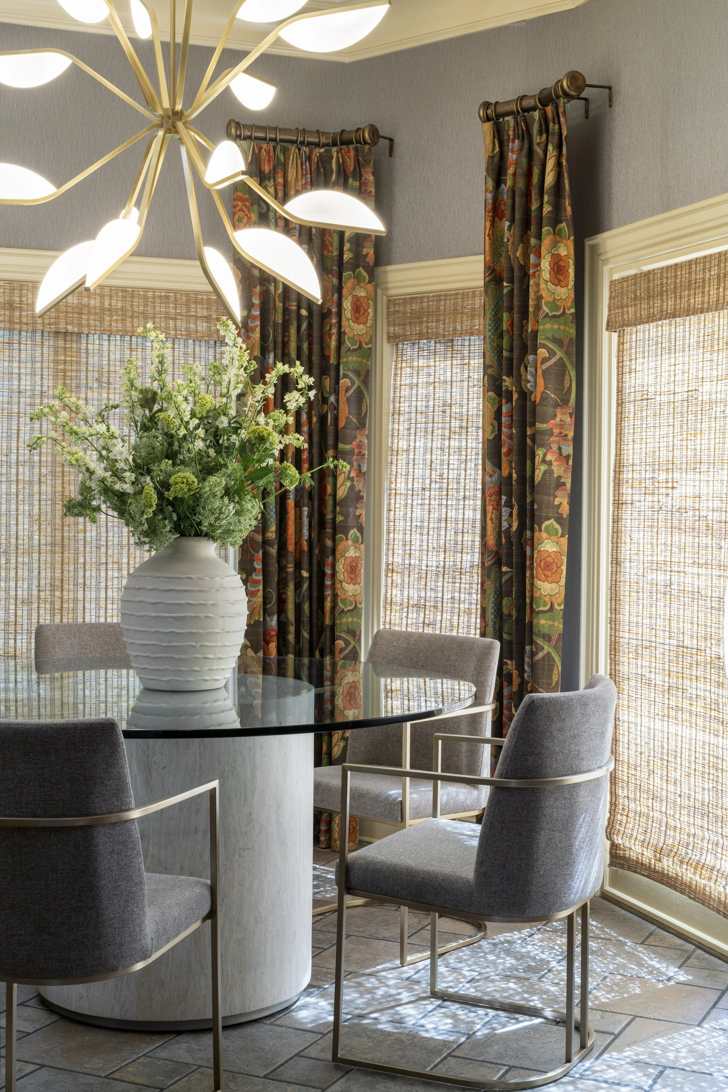 In the breakfast nook, new furniture and finishes were introduced to strike a balance between its traditional charm and contemporary sophistication. A cool blue wallpaper creates a serene backdrop, softening the warmth of the existing finishes and harmonizing with the client’s window treatments. A circular glass table and streamlined dining chairs lend an airy elegance. A sculptural chandelier adds a striking, modern focal point. Together, these elements infuse the space with lightness and polish, complementing the home’s architecture.