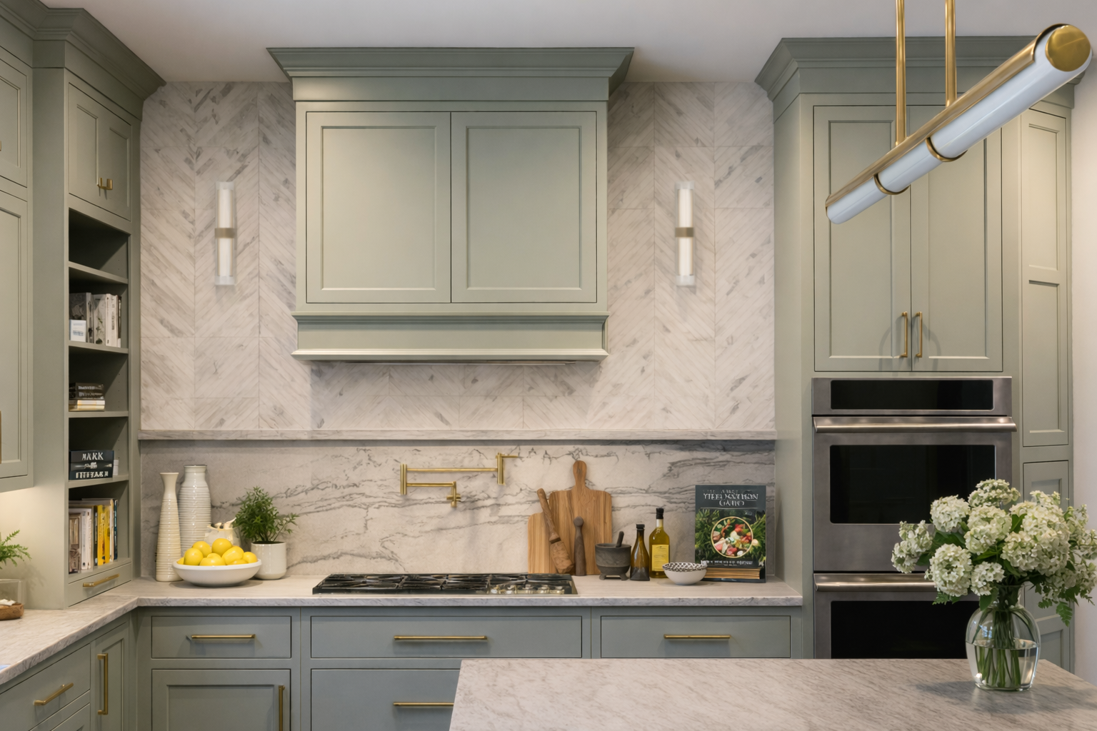 The kitchen is anchored by a substantial island with clean waterfall edges, establishing a strong architectural presence at the center of the room. Custom cabinetry in a soft sage hue introduces depth and quiet sophistication, offering a refined interpretation of classic millwork. The tone feels grounded and elegant, beautifully complementing the natural light that fills the space.